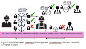 A blockchain is a distributed digital ledger technology with time-stamped and immutable blocks of data that do not need central storage nor a control authority, and each block is secured and linked, using cryptographic principles, that enables the decentralized documentation of peer-to-peer transaction across a network. Figures 1 and 2 show the simple illustrations of traditional and smart contracts set up and administration.